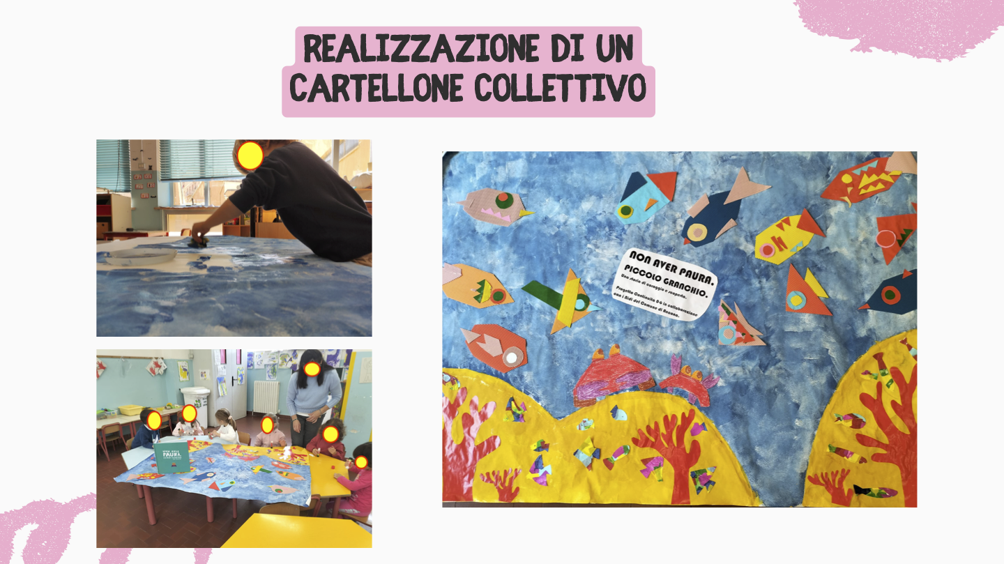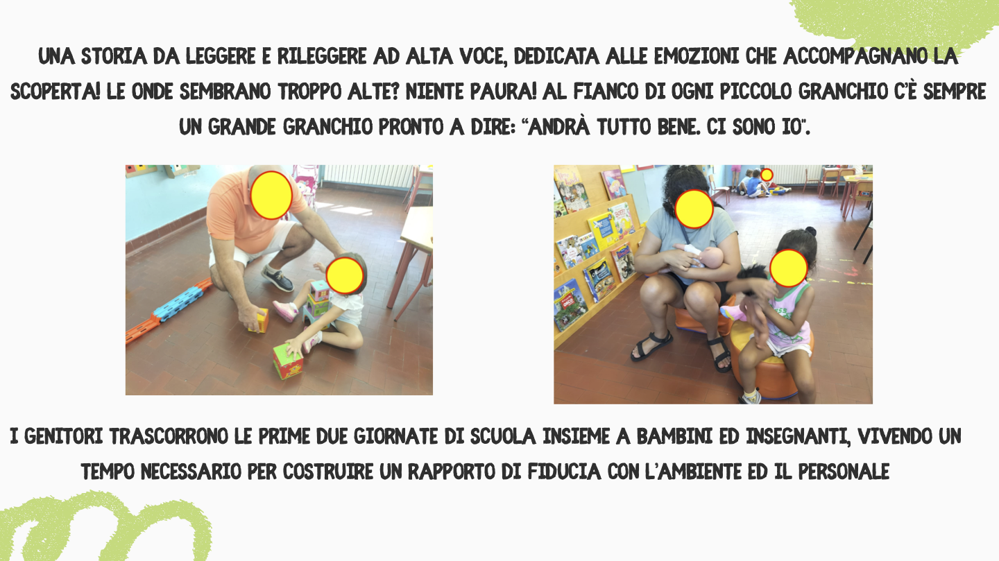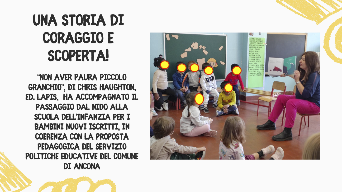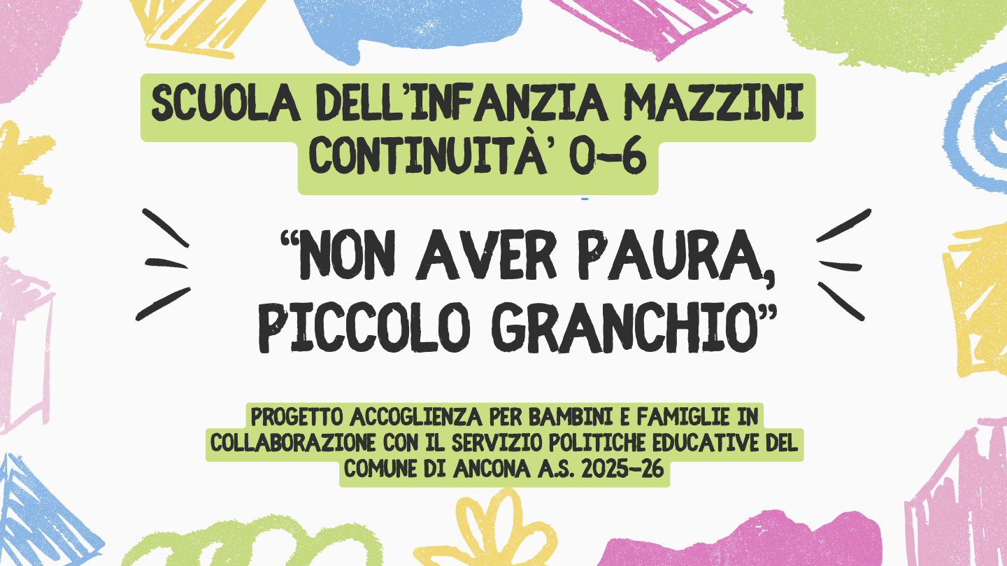 I docenti della Scuola dell’Infanzia Mazzini hanno svolto il progetto accoglienza per l’inserimento dei bambini nuovi iscritti utilizzando l’albo illustrato “Non Aver Paura Piccolo Granchio”, di Chris Haughton Ed. Lapis, in collaborazione con il Servizio Politiche Educative del Comune di Ancona che ha donato il testo alle scuole dell’infanzia per la continuità 0-6 con i nidi.