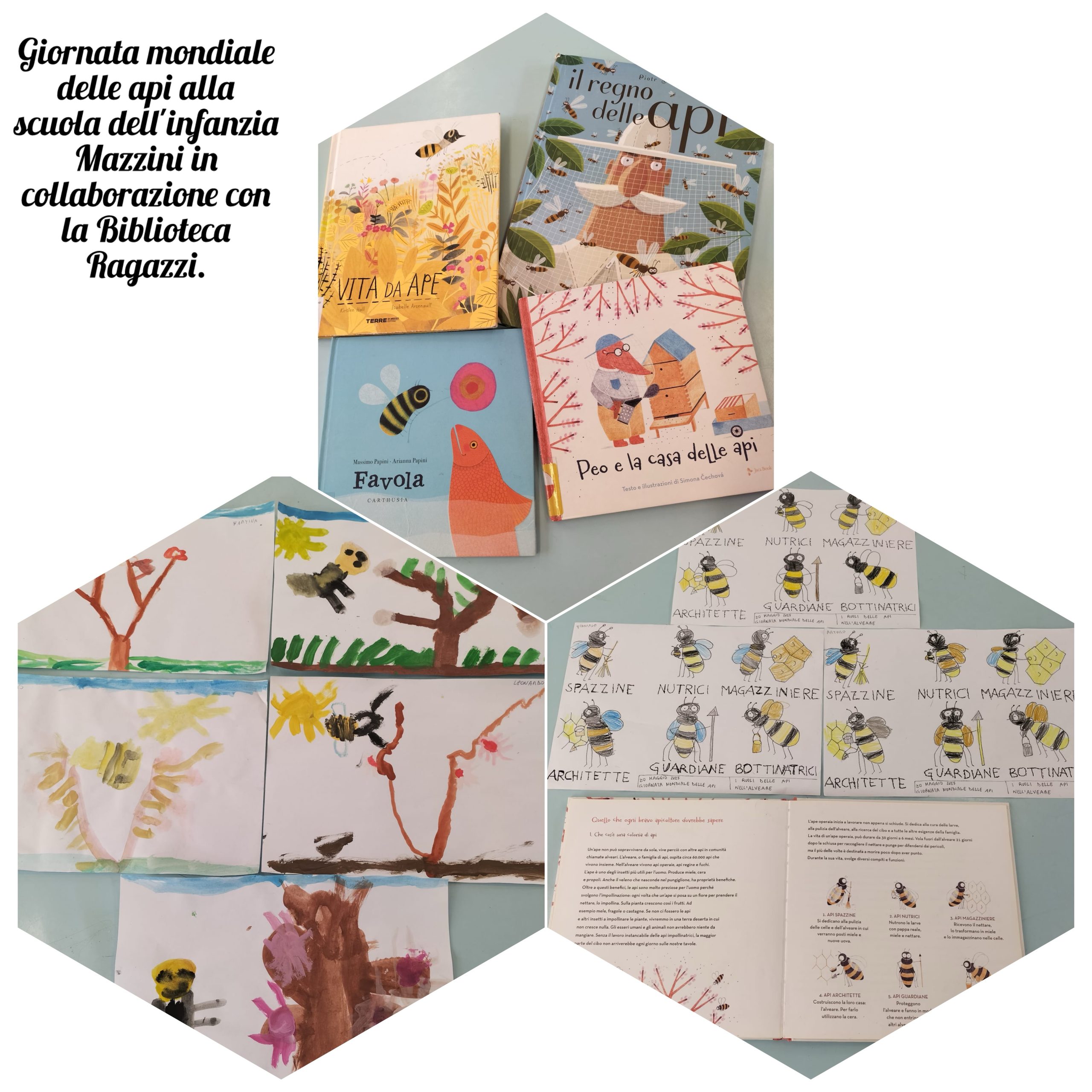 I bambini della scuola dell’infanzia Mazzini hanno letto dei bellissimi albi illustrati sulle api, imparando quanto sono preziosi questi insetti per l’uomo perché svolgono l’impollinazione. E così sulle piante crescono i frutti! Se non ci fossero le api e altri insetti impollinatori, gli esseri umani e gli animali non avrebbero niente da mangiare. Proteggere le api significa proteggere noi stessi!